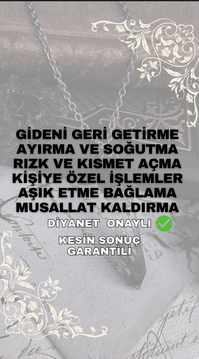 Ben rahmani işlemler yapan Medyum Cemal Hoca olarak, manevi danışmanlık ve özel çalışmalarla sizlere profesyonel hizmet sunuyorum. Hizmetlerim arasında bağlama işlemi, geri getirme ritüeli, eşi geri getirme, sevdiğini geri getirme, aşık etme ve kendine aşık etme çalışmaları yer almaktadır. Ayrıca yıldızname bakımı, vefk hazırlama, rızk ve kısmet açma, büyü bozma, papaz büyüsü çözme, kaşık büyüsü ve sabun büyüsü bozma işlemleri de yapılmaktadır.